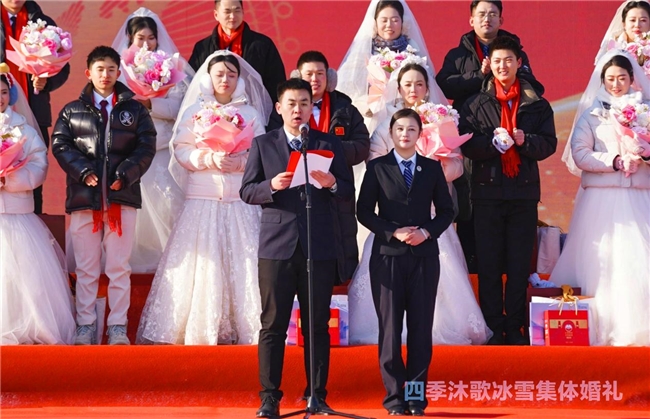 其实这场哈尔滨第42届“四季沐歌”公益冰雪集体婚礼,从新人征集之初就已经足见其诚意。从“免费办婚礼”“婚礼期间吃住行门票全免”,到新人征集报名期间,四季沐歌空气能提供的华为Mate70 Pro、四季沐歌净水机等重磅大奖,再到敬一丹、奥运冠军赵宏博、张虹、冰城左右哥倾情助阵打call,这场婚礼不仅成为了跨越地域与圈层的幸福盛宴,更吸引了全国各地的14510对新人踊跃报名,以及全网超6.8亿的关注热度和网友热议好评。当来自全国18个省、自治区和直辖市的42对新人来到哈尔滨奔赴北国浪漫之后才发现,等待他们的不仅是一场超越期待的冰雪集体婚礼,更是这座城市百年以来的高规格礼遇和极致浪漫。
